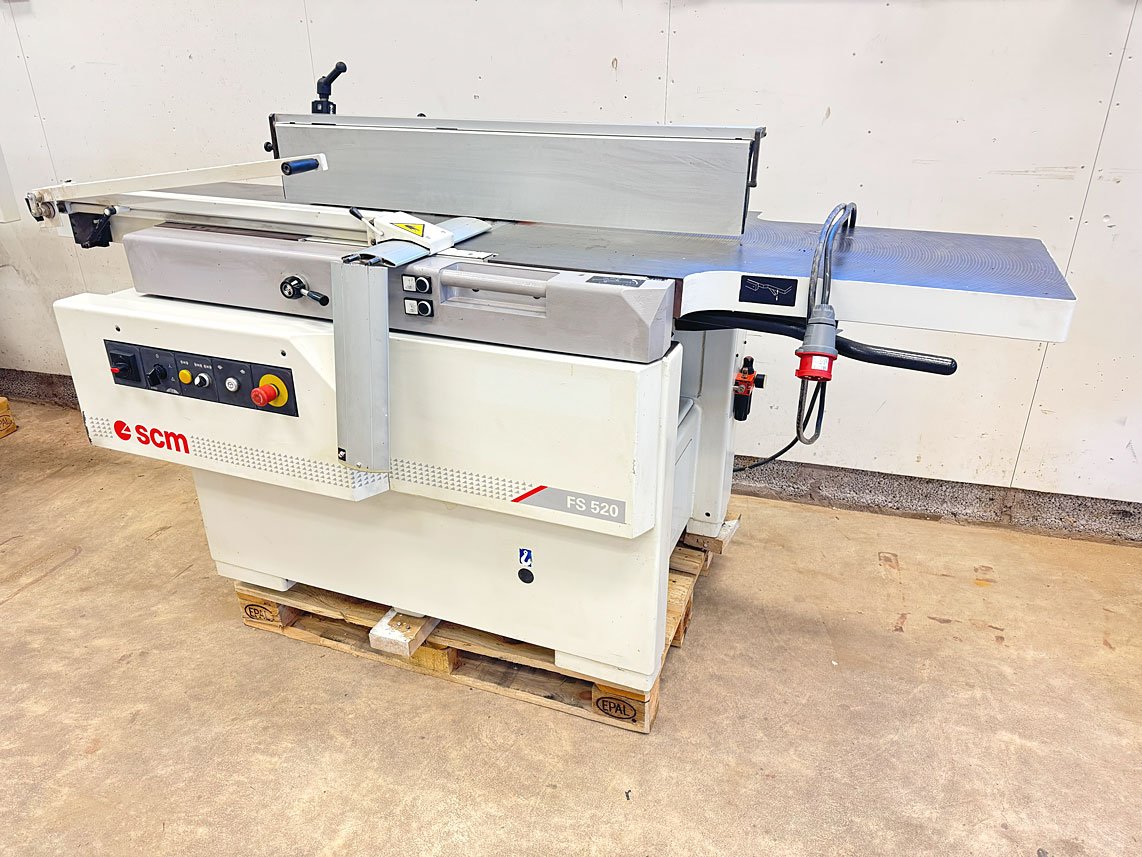 Rikt- Planhyvel SCM. SCM’s professionella Rikt-/planhyvel typ FS520 i högsta klass. Du byter från rikt till planhyvling enkelt med en knapptryckning på framsidan av maskinen. Stabilt och precist riktanhåll i aluminium som är vinkelbart 90° till -45°. Extrutrustad med fällbart hjälpanhåll för rikthyvling av låga ämnen samt stabil långhålsborr. Elektrisk höjning av planhyvelbord med digital avläsning. Planhyvelbord med 4-pelare. Utrustad med 4-skärs Tersa-kutter som ger ett perfekta hyvelresultat varje gång! Hyvelbredd: 520mm. Matningshastighet: 5-8-14-18m/min. Automatisk öppning av rikthyvelbord. Godkänd med nödstopp och broms. Lite körd, mycket fint skick.